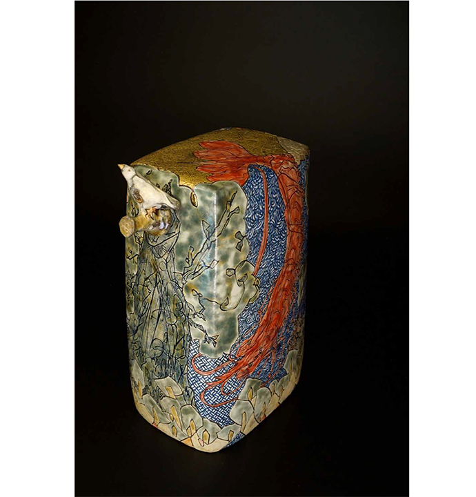 「線彫色絵枕型華器」